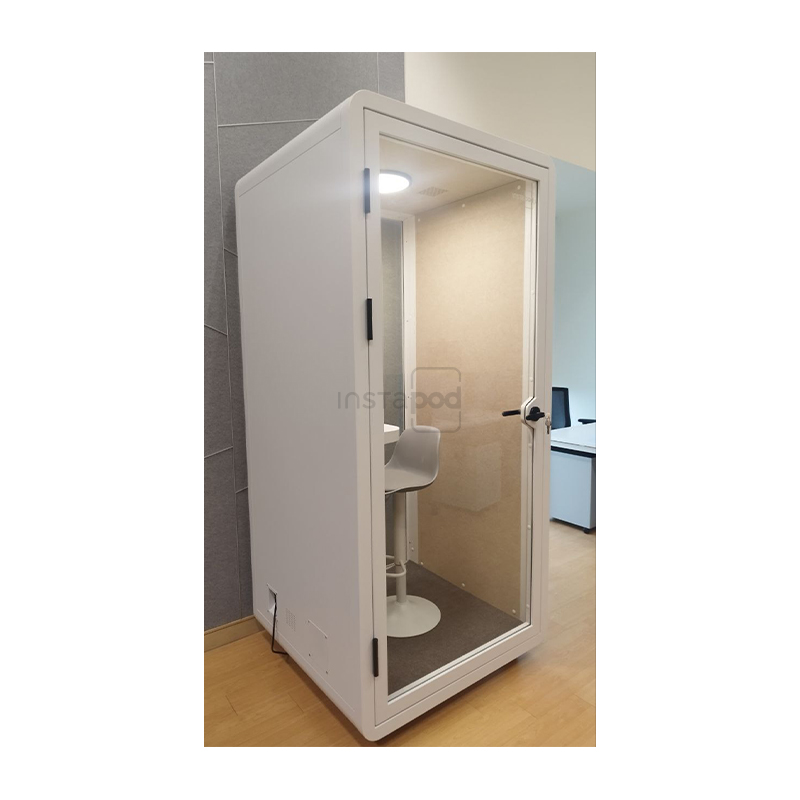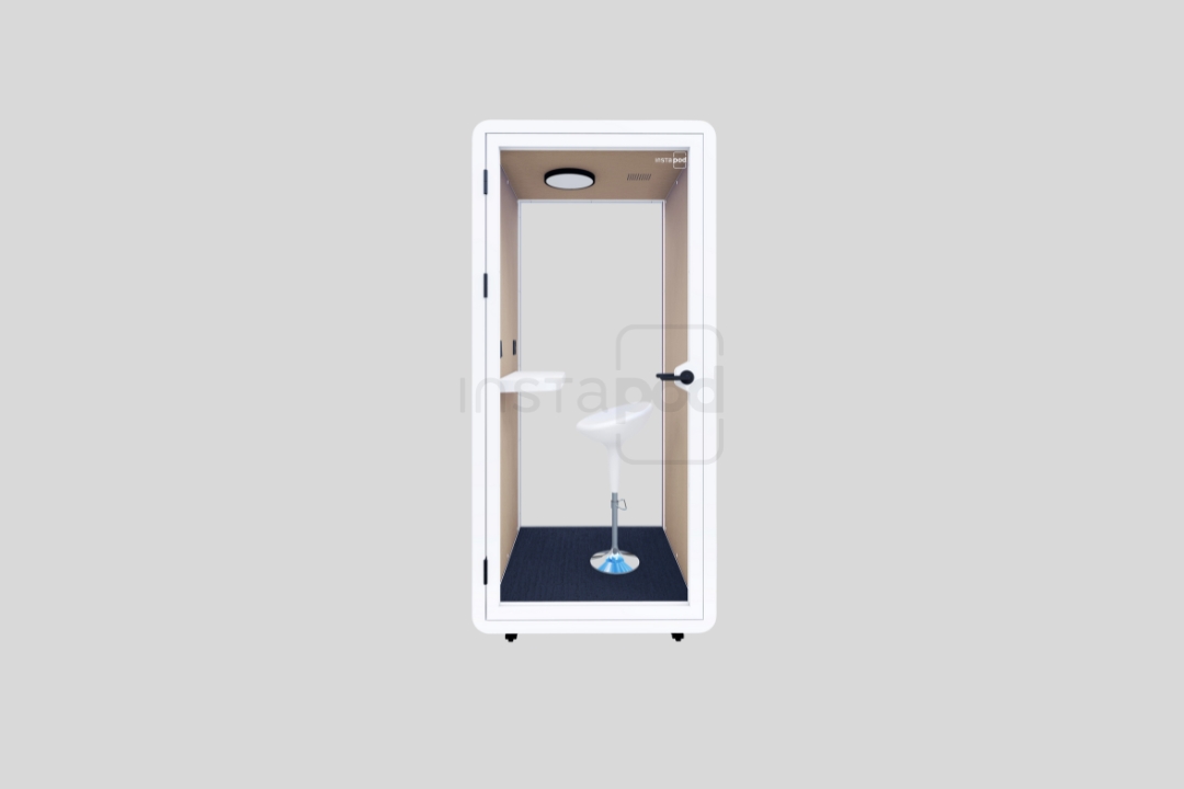 The Numero Series – InstaPod Solo is a compact indoor office pod designed for focused work, phone calls, and online meetings. This innovative silence pod features a modern white exterior and a light grey interior, blending seamlessly into any workspace. With its tempered glass doors, non-slip carpeting, and smooth casters, it offers a stylish and functional solution for privacy and productivity. Equipped with energy-efficient LED lighting, a universal power socket, USB Type A and Type C fast-charging ports, and built-in ventilation, the InstaPod Solo creates a quiet, comfortable environment for uninterrupted work in any office or home setting.